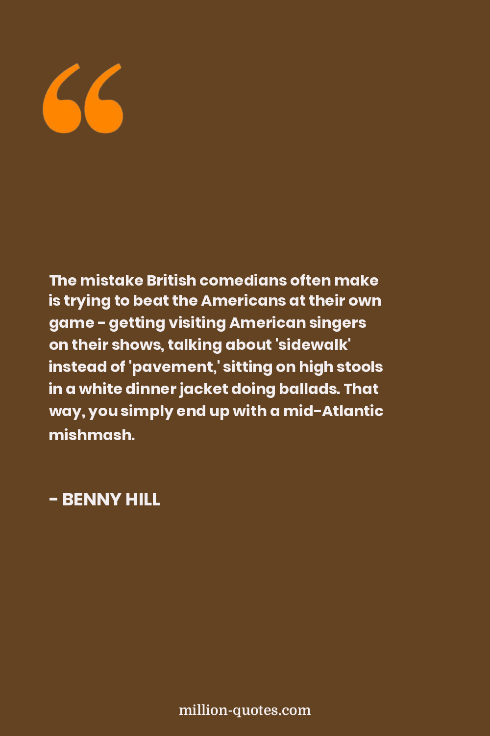 The mistake British comedians often make is trying to beat the Americans at their own game - getting visiting American singers on their shows, talking about 'sidewalk' instead of 'pavement,' sitting on high stools in a white dinner jacket doing ballads. That way, you simply end up with a mid-Atlantic mishmash.