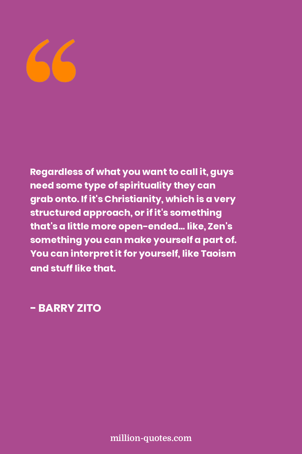 Regardless of what you want to call it, guys need some type of spirituality they can grab onto. If it's Christianity, which is a very structured approach, or if it's something that's a little more open-ended... like, Zen's something you can make yourself a part of. You can interpret it for yourself, like Taoism and stuff like that.