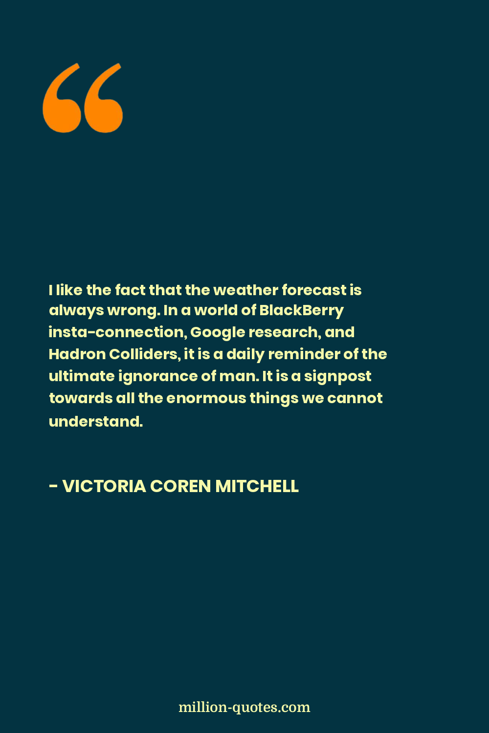I like the fact that the weather forecast is always wrong. In a world of BlackBerry insta-connection, Google research, and Hadron Colliders, it is a daily reminder of the ultimate ignorance of man. It is a signpost towards all the enormous things we cannot understand.