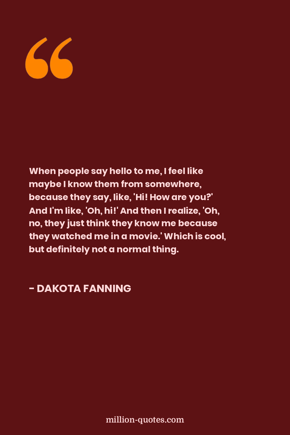When people say hello to me, I feel like maybe I know them from somewhere, because they say, like, 'Hi! How are you?' And I'm like, 'Oh, hi!' And then I realize, 'Oh, no, they just think they know me because they watched me in a movie.' Which is cool, but definitely not a normal thing.