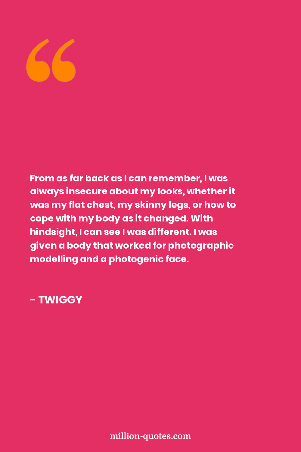 From as far back as I can remember, I was always insecure about my looks, whether it was my flat chest, my skinny legs, or how to cope with my body as it changed. With hindsight, I can see I was different. I was given a body that worked for photographic modelling and a photogenic face.