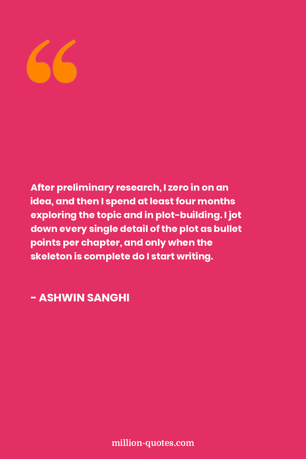 After preliminary research, I zero in on an idea, and then I spend at least four months exploring the topic and in plot-building. I jot down every single detail of the plot as bullet points per chapter, and only when the skeleton is complete do I start writing.