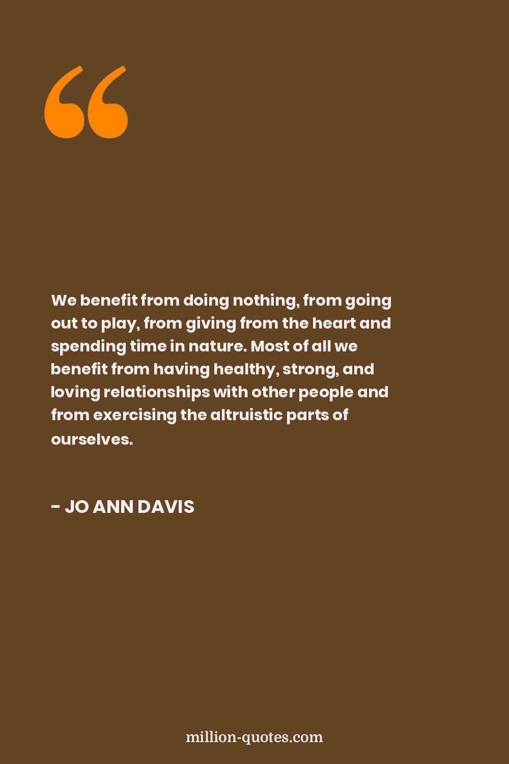 We benefit from doing nothing, from going out to play, from giving from the heart and spending time in nature. Most of all we benefit from having healthy, strong, and loving relationships with other people and from exercising the altruistic parts of ourselves.