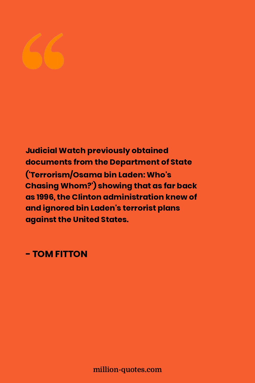 Judicial Watch previously obtained documents from the Department of State ('Terrorism/Osama bin Laden: Who's Chasing Whom?') showing that as far back as 1996, the Clinton administration knew of and ignored bin Laden's terrorist plans against the United States.
