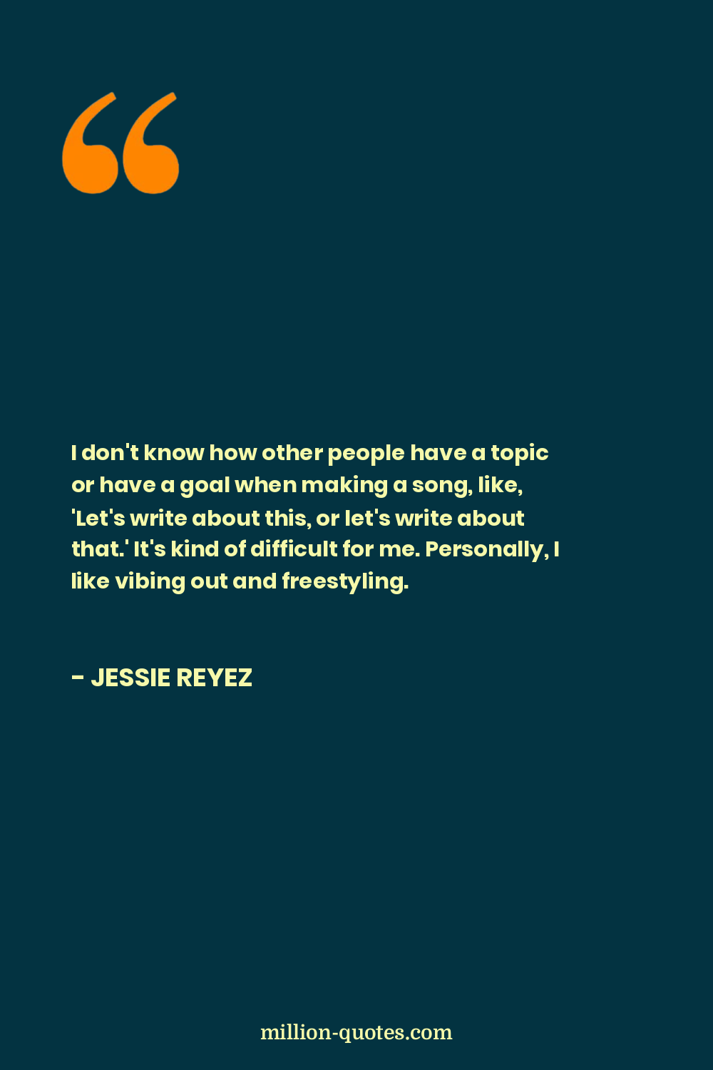 I don't know how other people have a topic or have a goal when making a song, like, 'Let's write about this, or let's write about that.' It's kind of difficult for me. Personally, I like vibing out and freestyling.
