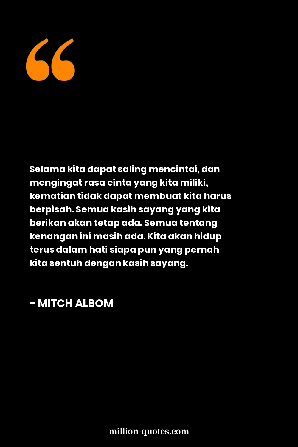Selama kita dapat saling mencintai, dan mengingat rasa cinta yang kita miliki, kematian tidak dapat membuat kita harus berpisah. Semua kasih sayang yang kita berikan akan tetap ada. Semua tentang kenangan ini masih ada. Kita akan hidup terus dalam hati siapa pun yang pernah kita sentuh dengan kasih sayang.