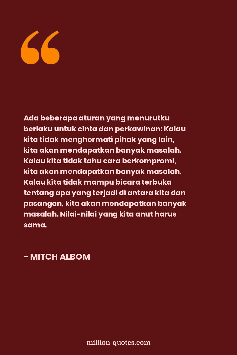 Ada beberapa aturan yang menurutku berlaku untuk cinta dan perkawinan: Kalau kita tidak menghormati pihak yang lain, kita akan mendapatkan banyak masalah. Kalau kita tidak tahu cara berkompromi, kita akan mendapatkan banyak masalah. Kalau kita tidak mampu bicara terbuka tentang apa yang terjadi di antara kita dan pasangan, kita akan mendapatkan banyak masalah. Nilai-nilai yang kita anut harus sama.