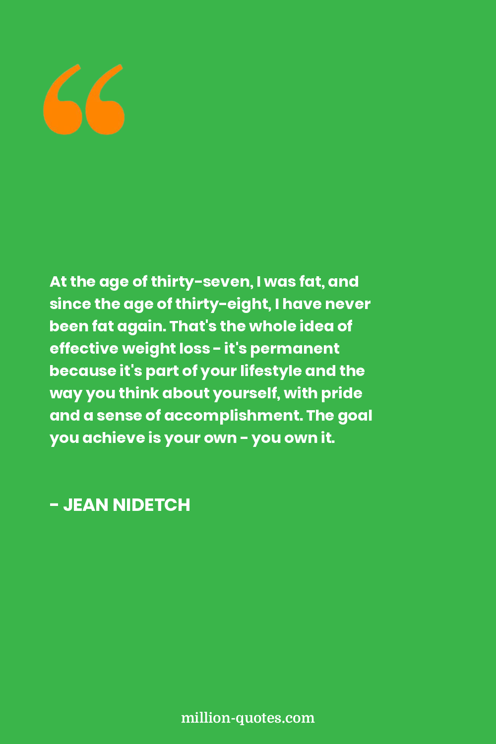 At the age of thirty-seven, I was fat, and since the age of thirty-eight, I have never been fat again. That's the whole idea of effective weight loss - it's permanent because it's part of your lifestyle and the way you think about yourself, with pride and a sense of accomplishment. The goal you achieve is your own - you own it.