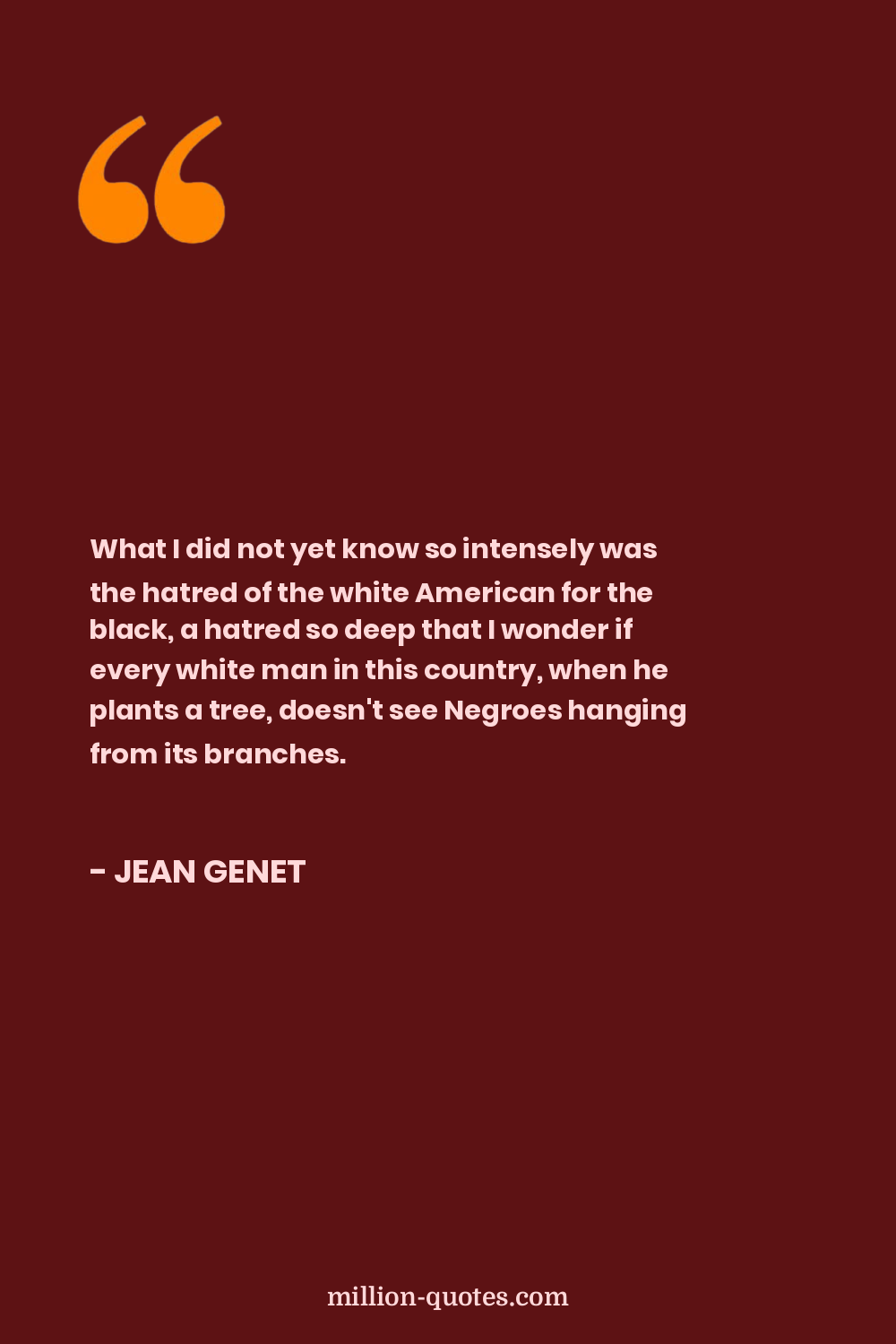 What I did not yet know so intensely was the hatred of the white American for the black, a hatred so deep that I wonder if every white man in this country, when he plants a tree, doesn't see Negroes hanging from its branches.