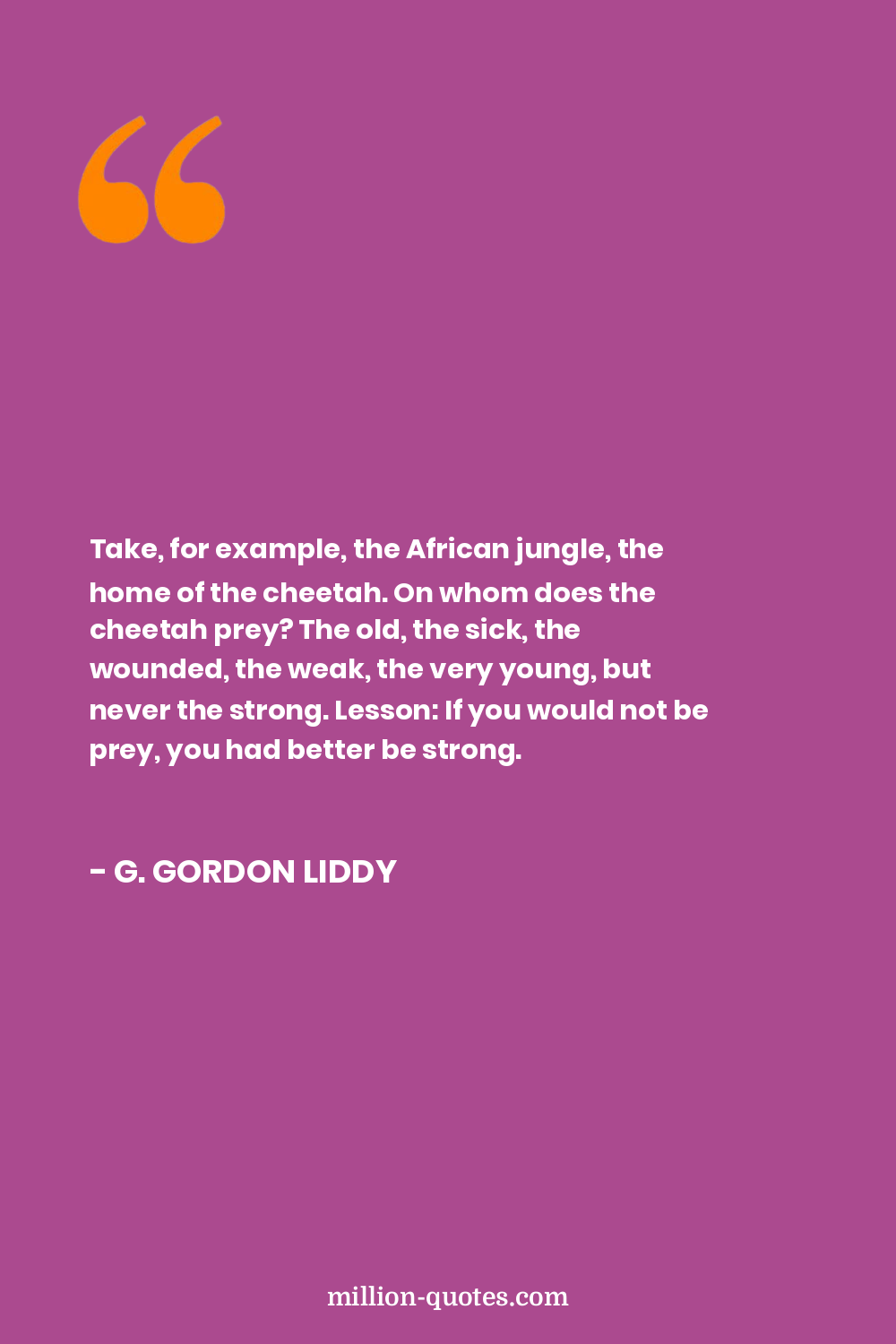 Take, for example, the African jungle, the home of the cheetah. On whom does the cheetah prey? The old, the sick, the wounded, the weak, the very young, but never the strong. Lesson: If you would not be prey, you had better be strong.
