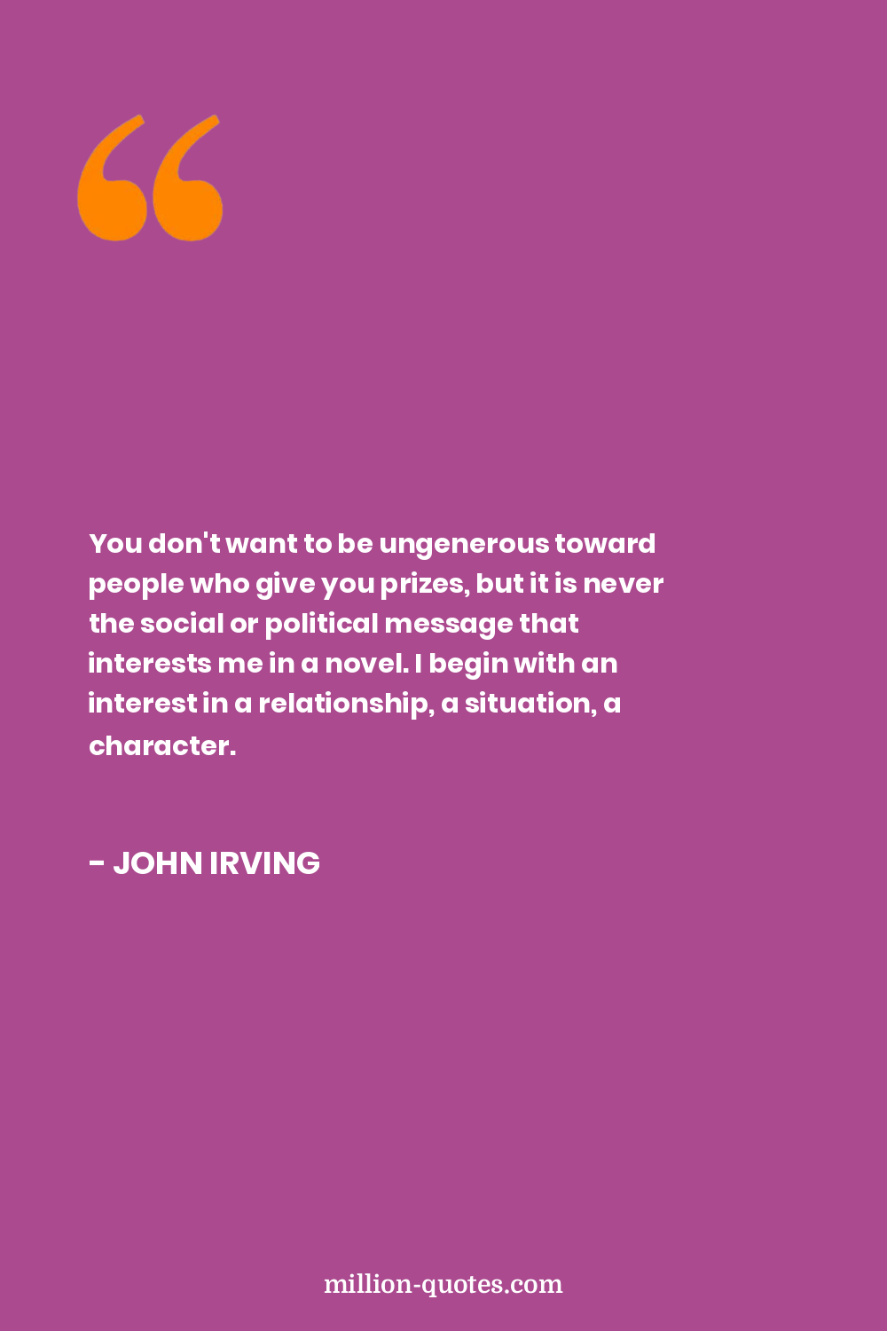 You don't want to be ungenerous toward people who give you prizes, but it is never the social or political message that interests me in a novel. I begin with an interest in a relationship, a situation, a character.