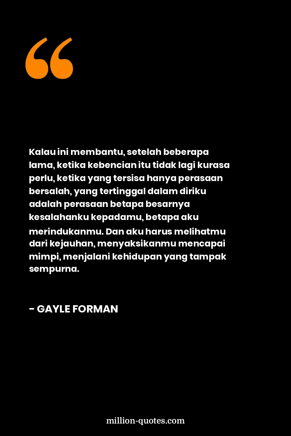 Kalau ini membantu, setelah beberapa lama, ketika kebencian itu tidak lagi kurasa perlu, ketika yang tersisa hanya perasaan bersalah, yang tertinggal dalam diriku adalah perasaan betapa besarnya kesalahanku kepadamu, betapa aku merindukanmu. Dan aku harus melihatmu dari kejauhan, menyaksikanmu mencapai mimpi, menjalani kehidupan yang tampak sempurna.