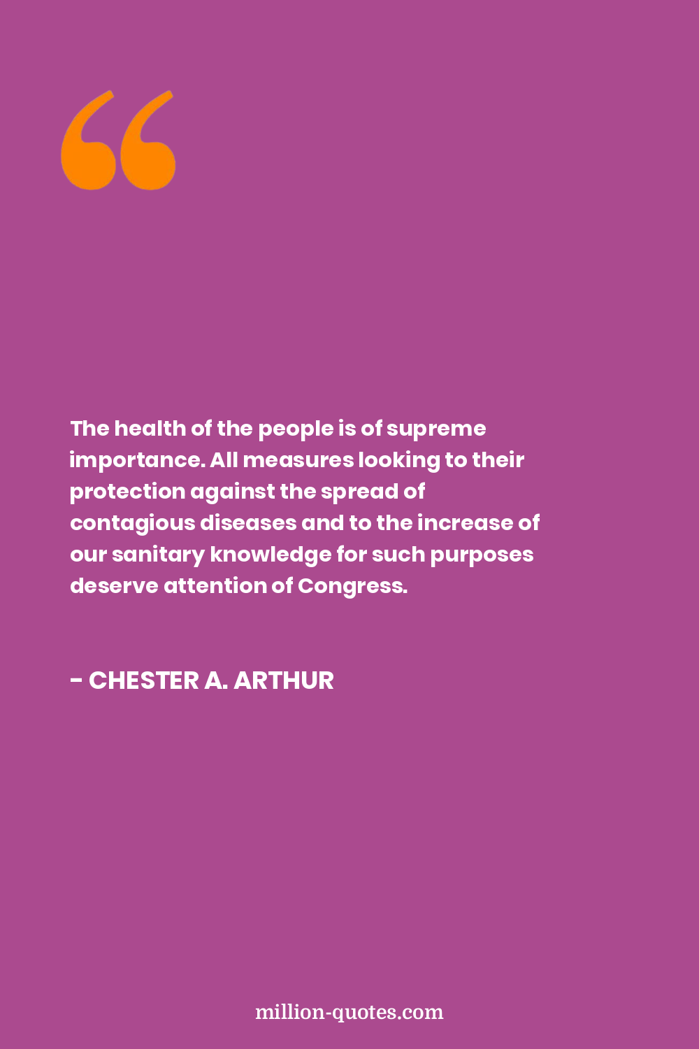 The health of the people is of supreme importance. All measures looking to their protection against the spread of contagious diseases and to the increase of our sanitary knowledge for such purposes deserve attention of Congress.