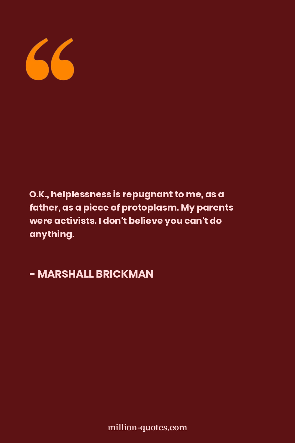 O.K., helplessness is repugnant to me, as a father, as a piece of protoplasm. My parents were activists. I don't believe you can't do anything.