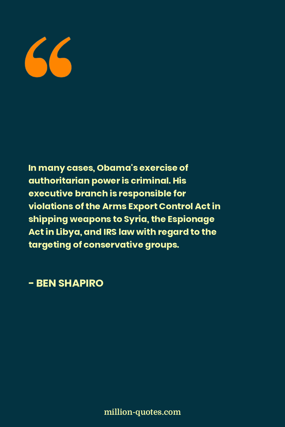 In many cases, Obama's exercise of authoritarian power is criminal. His executive branch is responsible for violations of the Arms Export Control Act in shipping weapons to Syria, the Espionage Act in Libya, and IRS law with regard to the targeting of conservative groups.