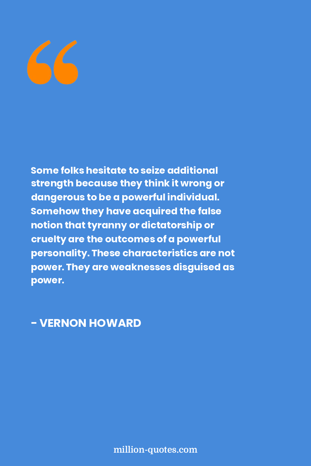Some folks hesitate to seize additional strength because they think it wrong or dangerous to be a powerful individual. Somehow they have acquired the false notion that tyranny or dictatorship or cruelty are the outcomes of a powerful personality. These characteristics are not power. They are weaknesses disguised as power.