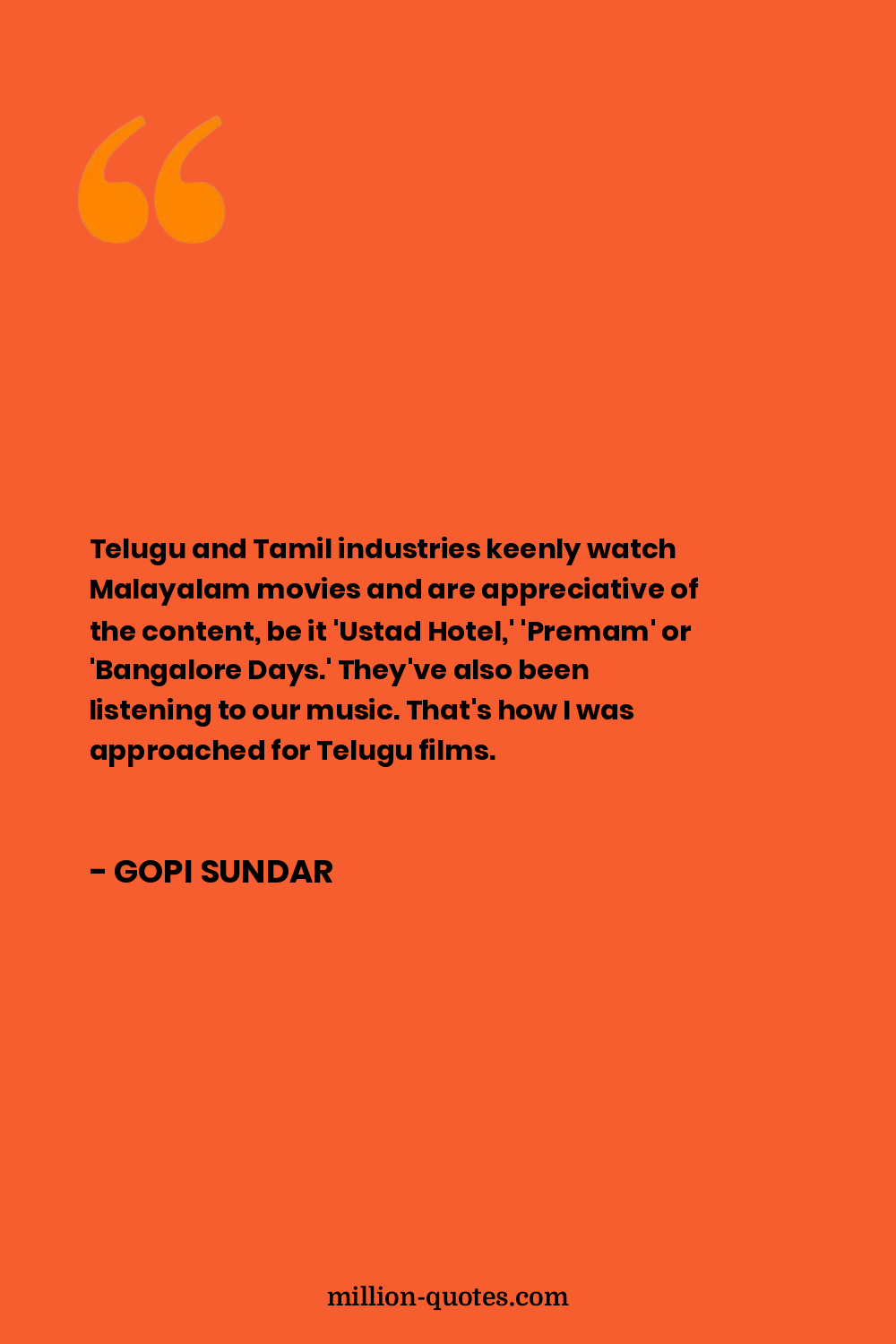 Telugu and Tamil industries keenly watch Malayalam movies and are appreciative of the content, be it 'Ustad Hotel,' 'Premam' or 'Bangalore Days.' They've also been listening to our music. That's how I was approached for Telugu films.