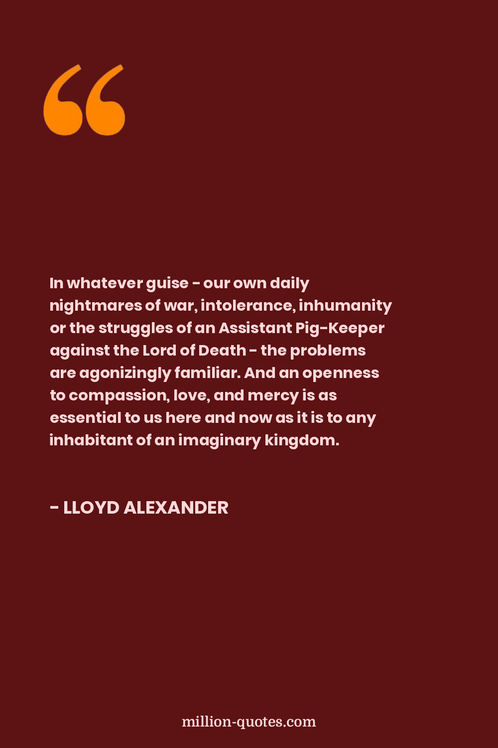 In whatever guise - our own daily nightmares of war, intolerance, inhumanity or the struggles of an Assistant Pig-Keeper against the Lord of Death - the problems are agonizingly familiar. And an openness to compassion, love, and mercy is as essential to us here and now as it is to any inhabitant of an imaginary kingdom.