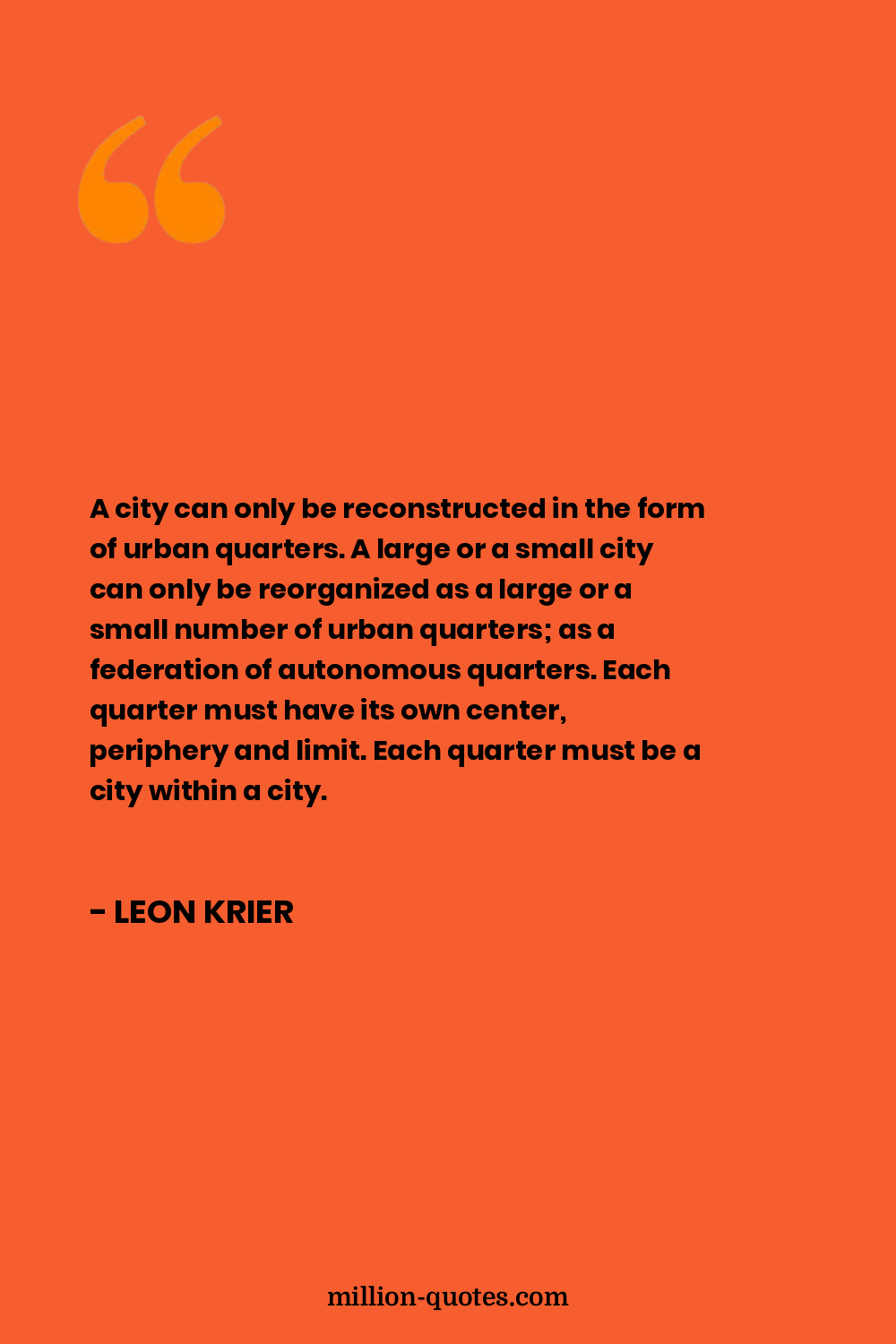 A city can only be reconstructed in the form of urban quarters. A large or a small city can only be reorganized as a large or a small number of urban quarters; as a federation of autonomous quarters. Each quarter must have its own center, periphery and limit. Each quarter must be a city within a city.