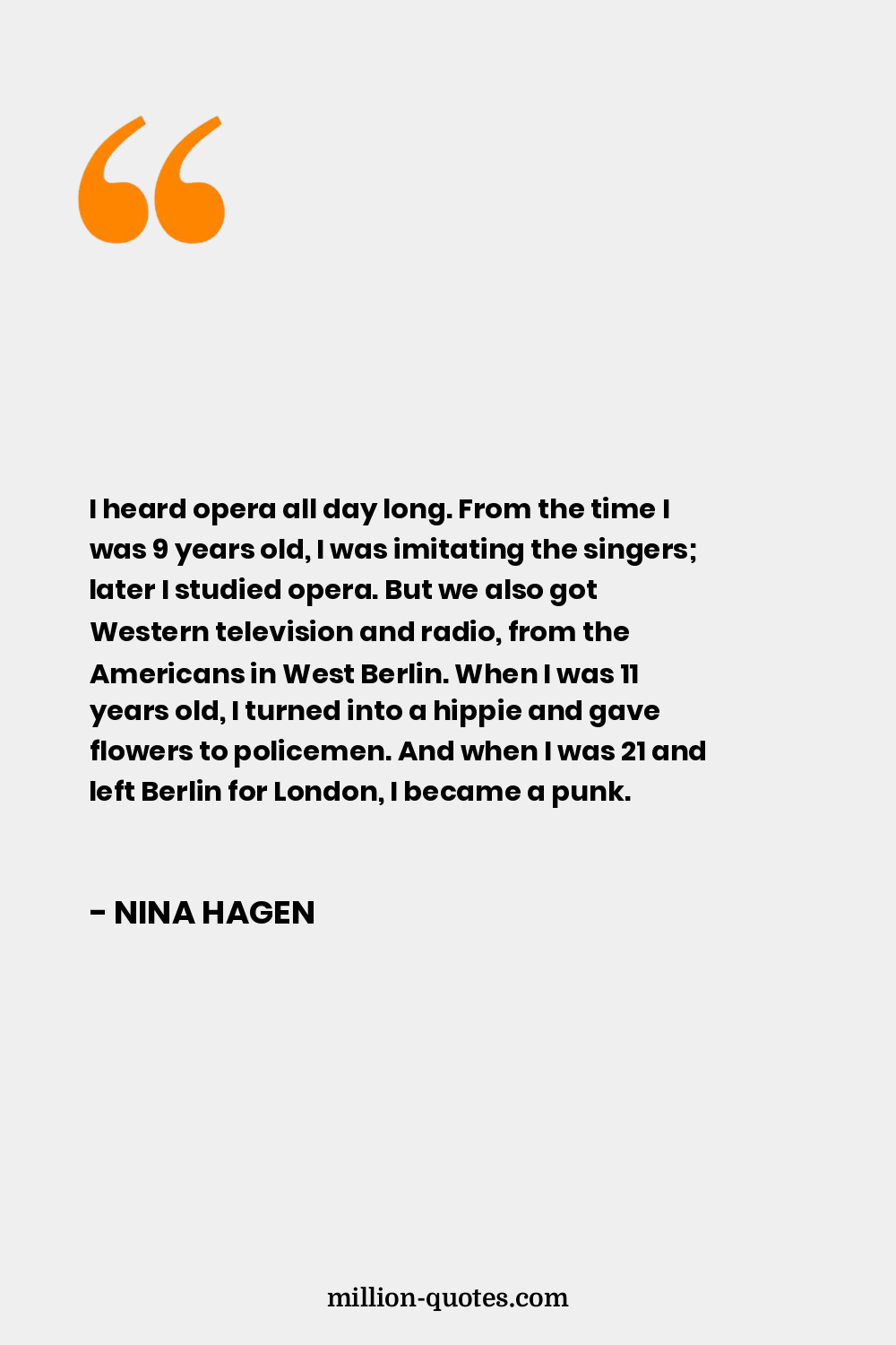 I heard opera all day long. From the time I was 9 years old, I was imitating the singers; later I studied opera. But we also got Western television and radio, from the Americans in West Berlin. When I was 11 years old, I turned into a hippie and gave flowers to policemen. And when I was 21 and left Berlin for London, I became a punk.