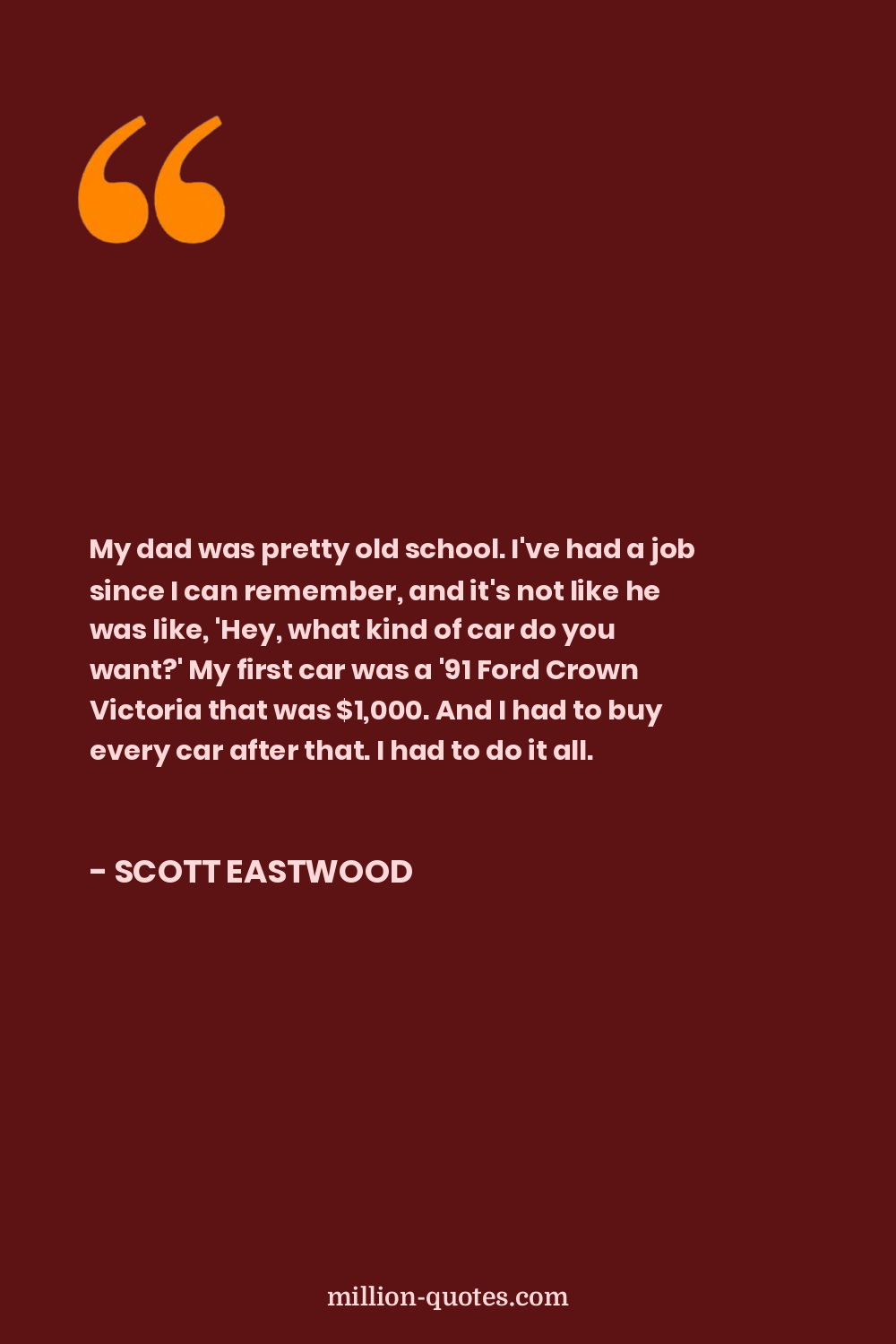 My dad was pretty old school. I've had a job since I can remember, and it's not like he was like, 'Hey, what kind of car do you want?' My first car was a '91 Ford Crown Victoria that was $1,000. And I had to buy every car after that. I had to do it all.