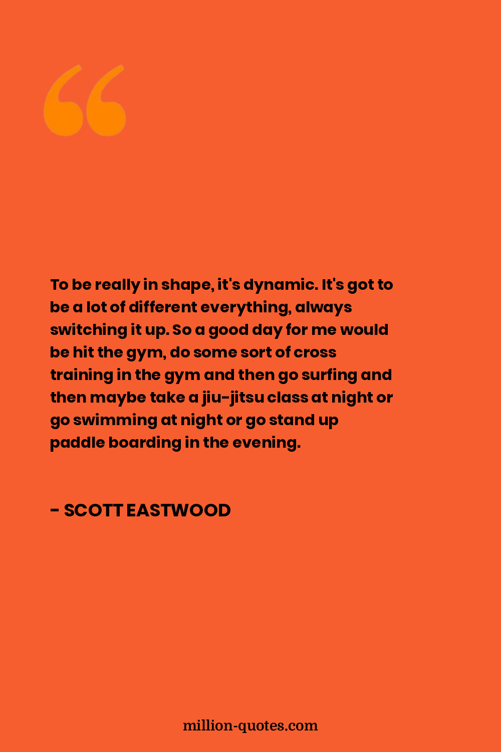 To be really in shape, it's dynamic. It's got to be a lot of different everything, always switching it up. So a good day for me would be hit the gym, do some sort of cross training in the gym and then go surfing and then maybe take a jiu-jitsu class at night or go swimming at night or go stand up paddle boarding in the evening.
