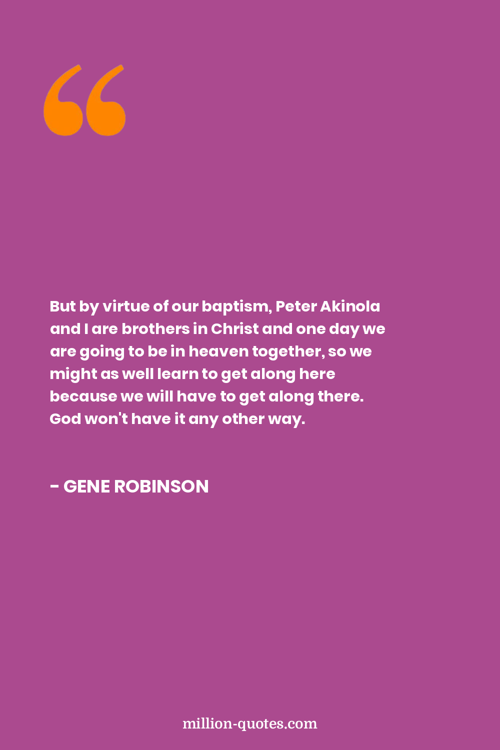 But by virtue of our baptism, Peter Akinola and I are brothers in Christ and one day we are going to be in heaven together, so we might as well learn to get along here because we will have to get along there. God won't have it any other way.