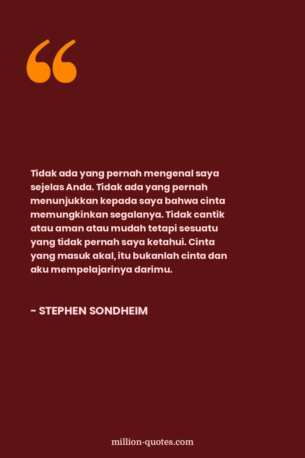 Tidak ada yang pernah mengenal saya sejelas Anda. Tidak ada yang pernah menunjukkan kepada saya bahwa cinta memungkinkan segalanya. Tidak cantik atau aman atau mudah tetapi sesuatu yang tidak pernah saya ketahui. Cinta yang masuk akal, itu bukanlah cinta dan aku mempelajarinya darimu.