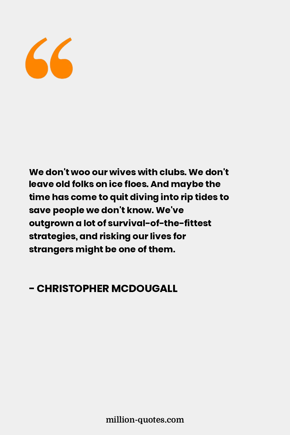We don't woo our wives with clubs. We don't leave old folks on ice floes. And maybe the time has come to quit diving into rip tides to save people we don't know. We've outgrown a lot of survival-of-the-fittest strategies, and risking our lives for strangers might be one of them.