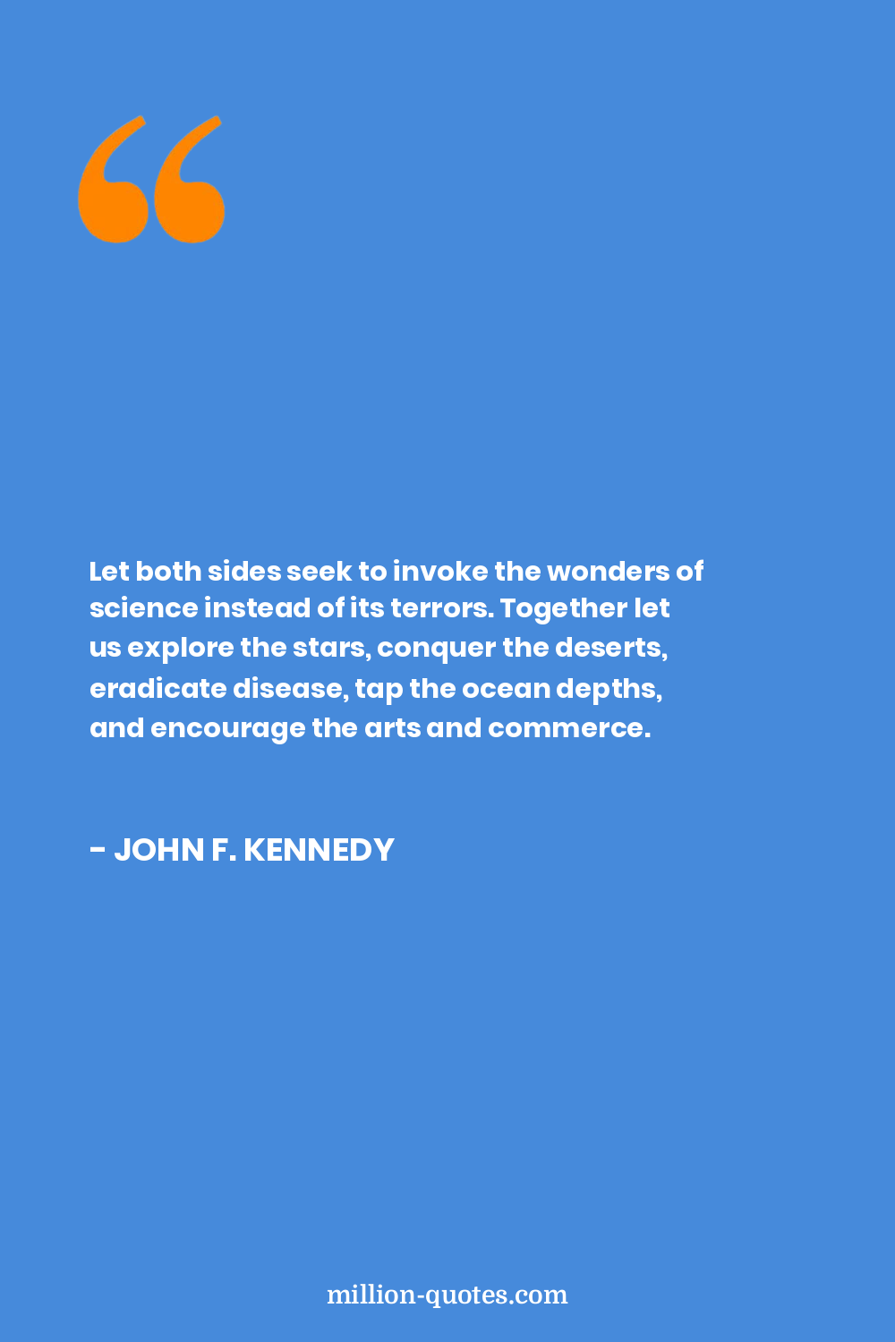 Let both sides seek to invoke the wonders of science instead of its terrors. Together let us explore the stars, conquer the deserts, eradicate disease, tap the ocean depths, and encourage the arts and commerce.