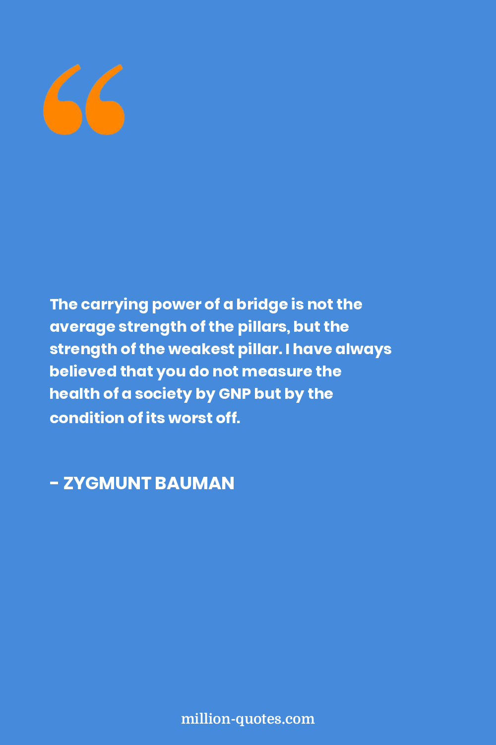 The carrying power of a bridge is not the average strength of the pillars, but the strength of the weakest pillar. I have always believed that you do not measure the health of a society by GNP but by the condition of its worst off.