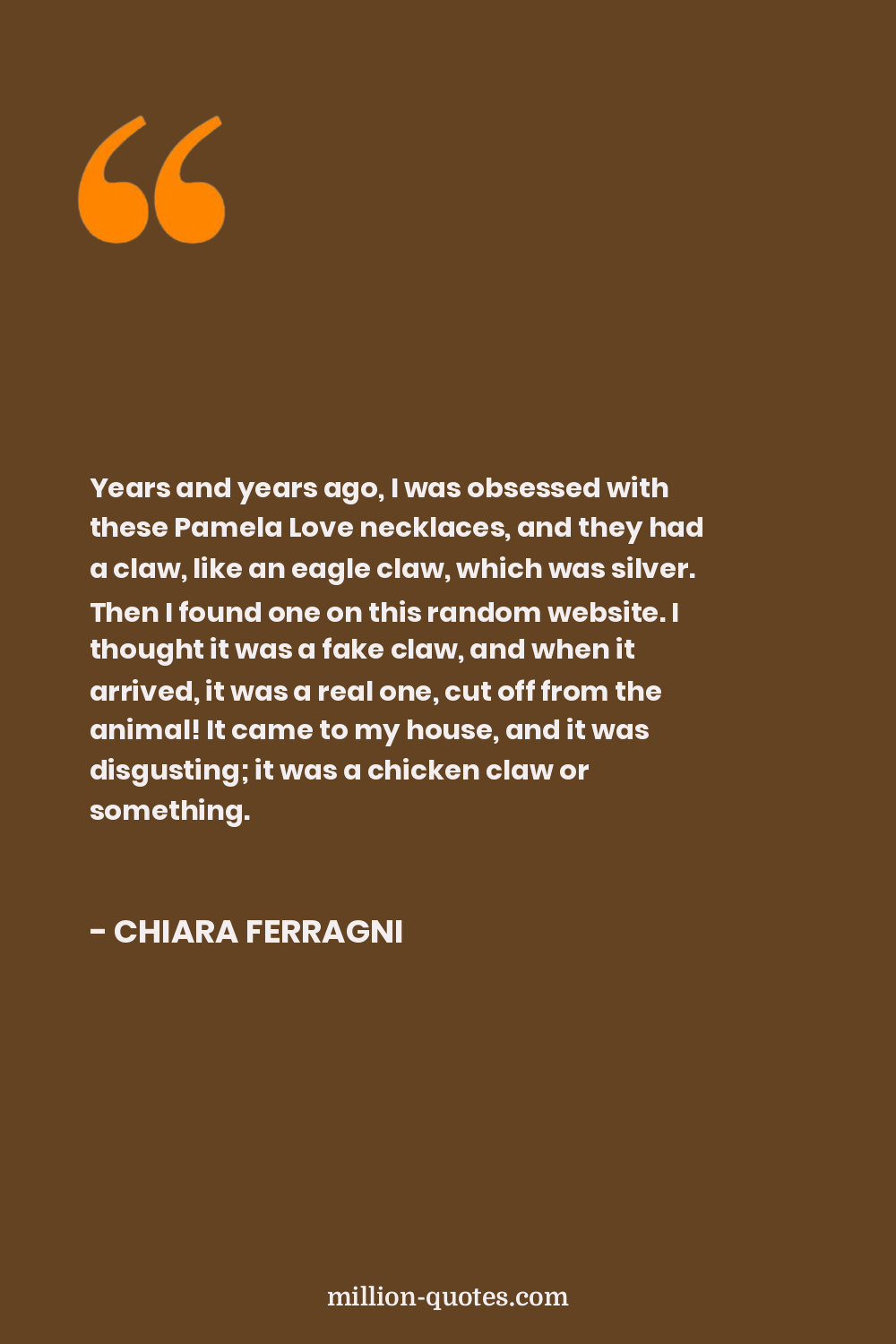 Years and years ago, I was obsessed with these Pamela Love necklaces, and they had a claw, like an eagle claw, which was silver. Then I found one on this random website. I thought it was a fake claw, and when it arrived, it was a real one, cut off from the animal! It came to my house, and it was disgusting; it was a chicken claw or something.