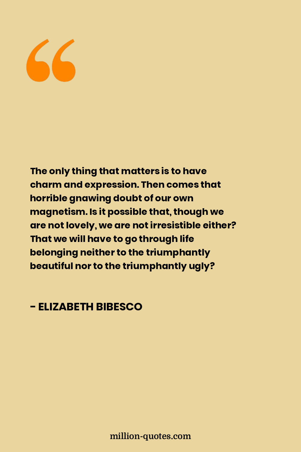 The only thing that matters is to have charm and expression. Then comes that horrible gnawing doubt of our own magnetism. Is it possible that, though we are not lovely, we are not irresistible either? That we will have to go through life belonging neither to the triumphantly beautiful nor to the triumphantly ugly?