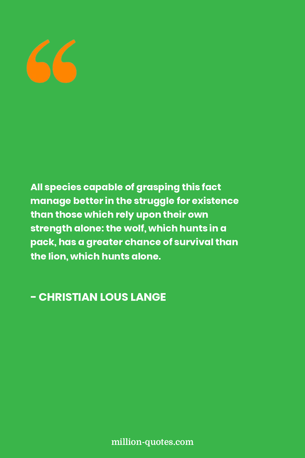 All species capable of grasping this fact manage better in the struggle for existence than those which rely upon their own strength alone: the wolf, which hunts in a pack, has a greater chance of survival than the lion, which hunts alone.