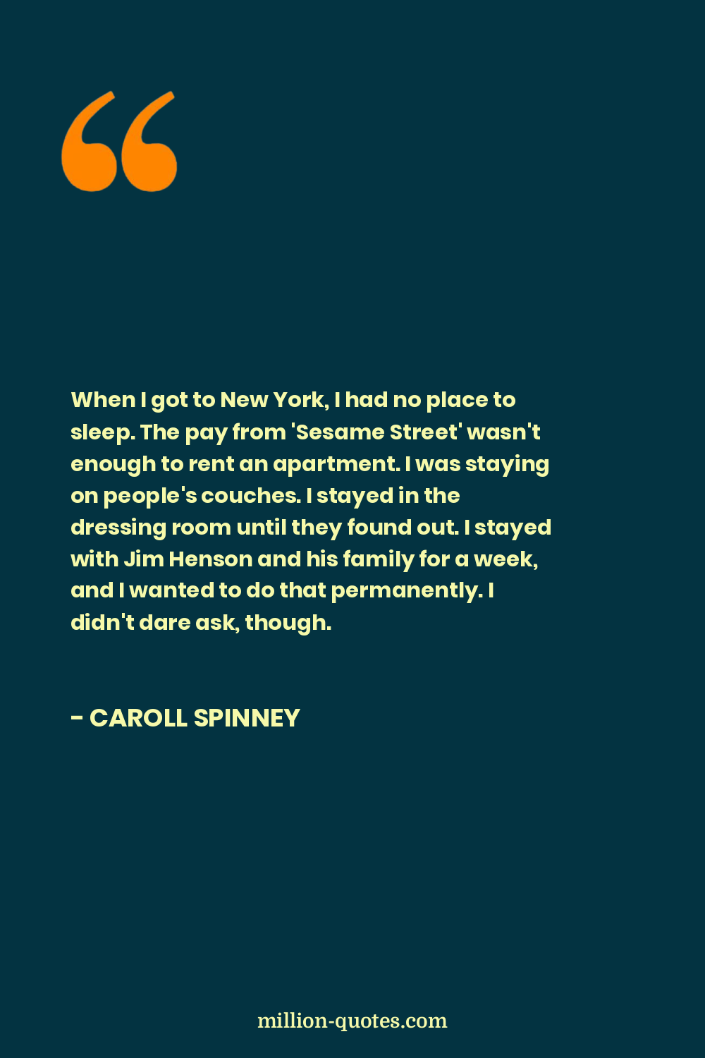 When I got to New York, I had no place to sleep. The pay from 'Sesame Street' wasn't enough to rent an apartment. I was staying on people's couches. I stayed in the dressing room until they found out. I stayed with Jim Henson and his family for a week, and I wanted to do that permanently. I didn't dare ask, though.