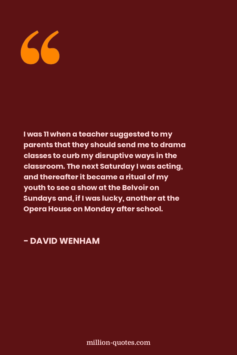 I was 11 when a teacher suggested to my parents that they should send me to drama classes to curb my disruptive ways in the classroom. The next Saturday I was acting, and thereafter it became a ritual of my youth to see a show at the Belvoir on Sundays and, if I was lucky, another at the Opera House on Monday after school.