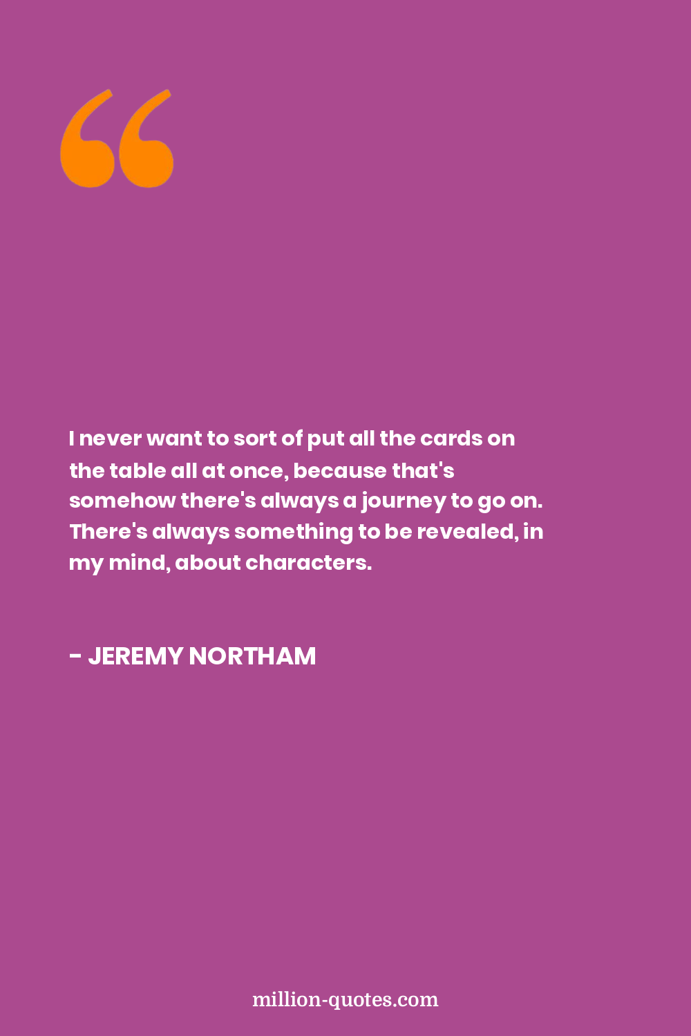 I never want to sort of put all the cards on the table all at once, because that's somehow there's always a journey to go on. There's always something to be revealed, in my mind, about characters.