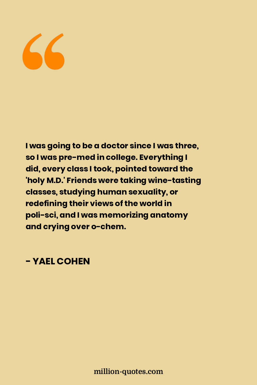 I was going to be a doctor since I was three, so I was pre-med in college. Everything I did, every class I took, pointed toward the 'holy M.D.' Friends were taking wine-tasting classes, studying human sexuality, or redefining their views of the world in poli-sci, and I was memorizing anatomy and crying over o-chem.