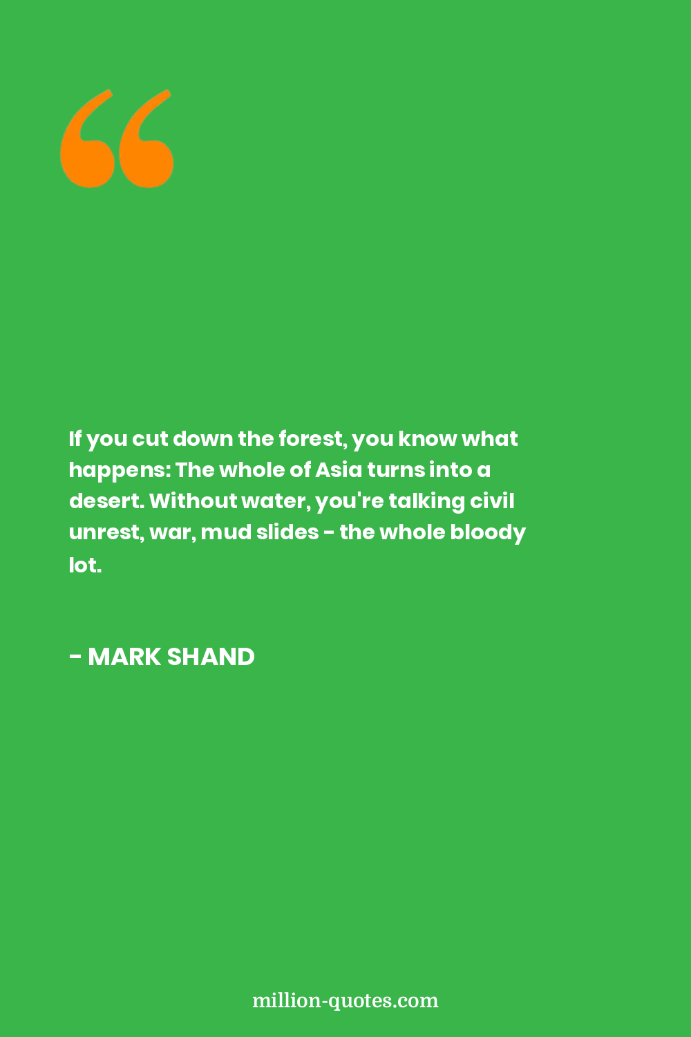 If you cut down the forest, you know what happens: The whole of Asia turns into a desert. Without water, you're talking civil unrest, war, mud slides - the whole bloody lot.