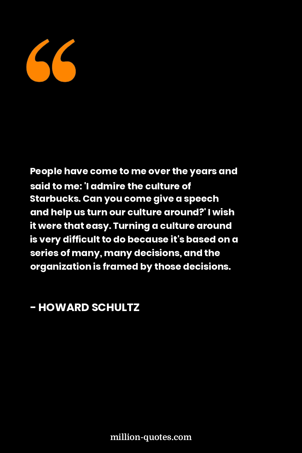 People have come to me over the years and said to me: 'I admire the culture of Starbucks. Can you come give a speech and help us turn our culture around?' I wish it were that easy. Turning a culture around is very difficult to do because it's based on a series of many, many decisions, and the organization is framed by those decisions.