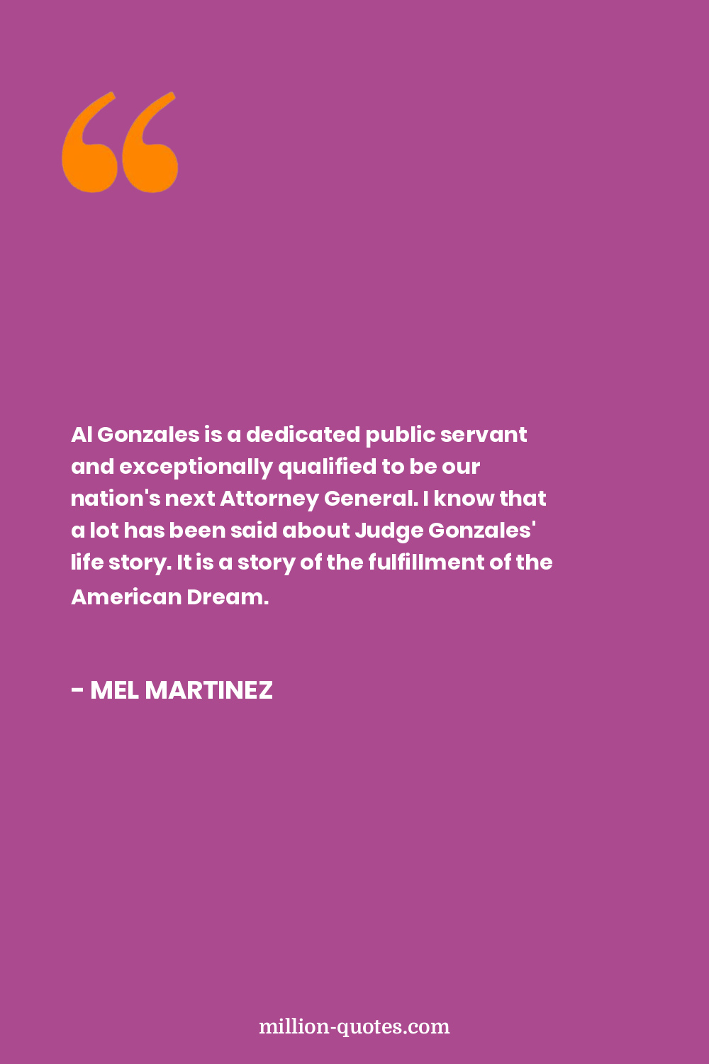 Al Gonzales is a dedicated public servant and exceptionally qualified to be our nation's next Attorney General. I know that a lot has been said about Judge Gonzales' life story. It is a story of the fulfillment of the American Dream.