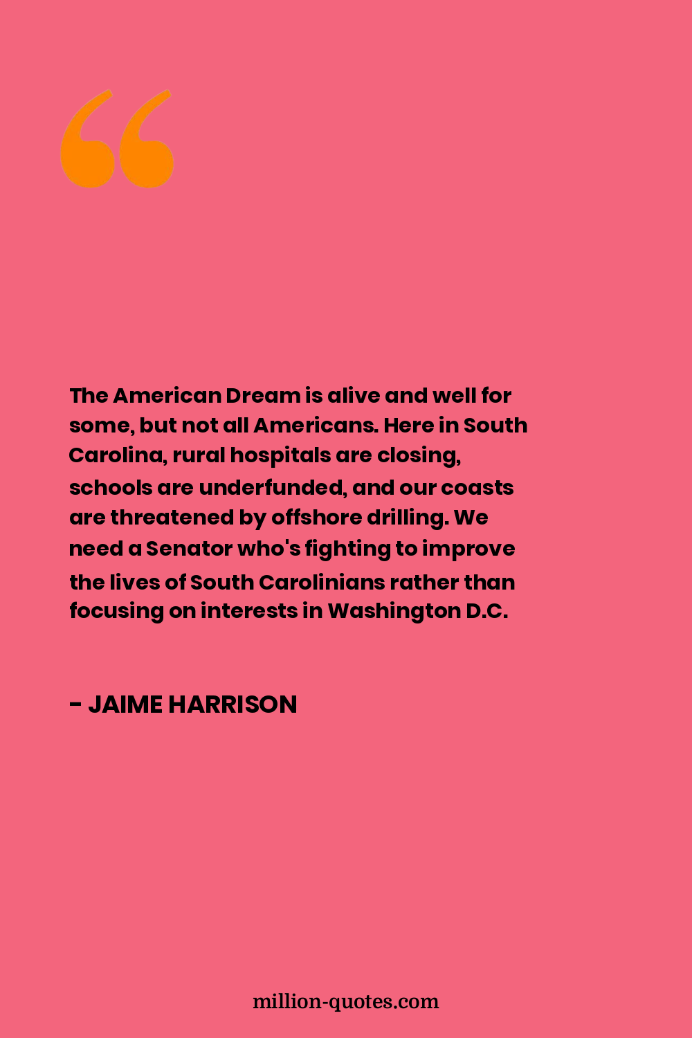 The American Dream is alive and well for some, but not all Americans. Here in South Carolina, rural hospitals are closing, schools are underfunded, and our coasts are threatened by offshore drilling. We need a Senator who's fighting to improve the lives of South Carolinians rather than focusing on interests in Washington D.C.