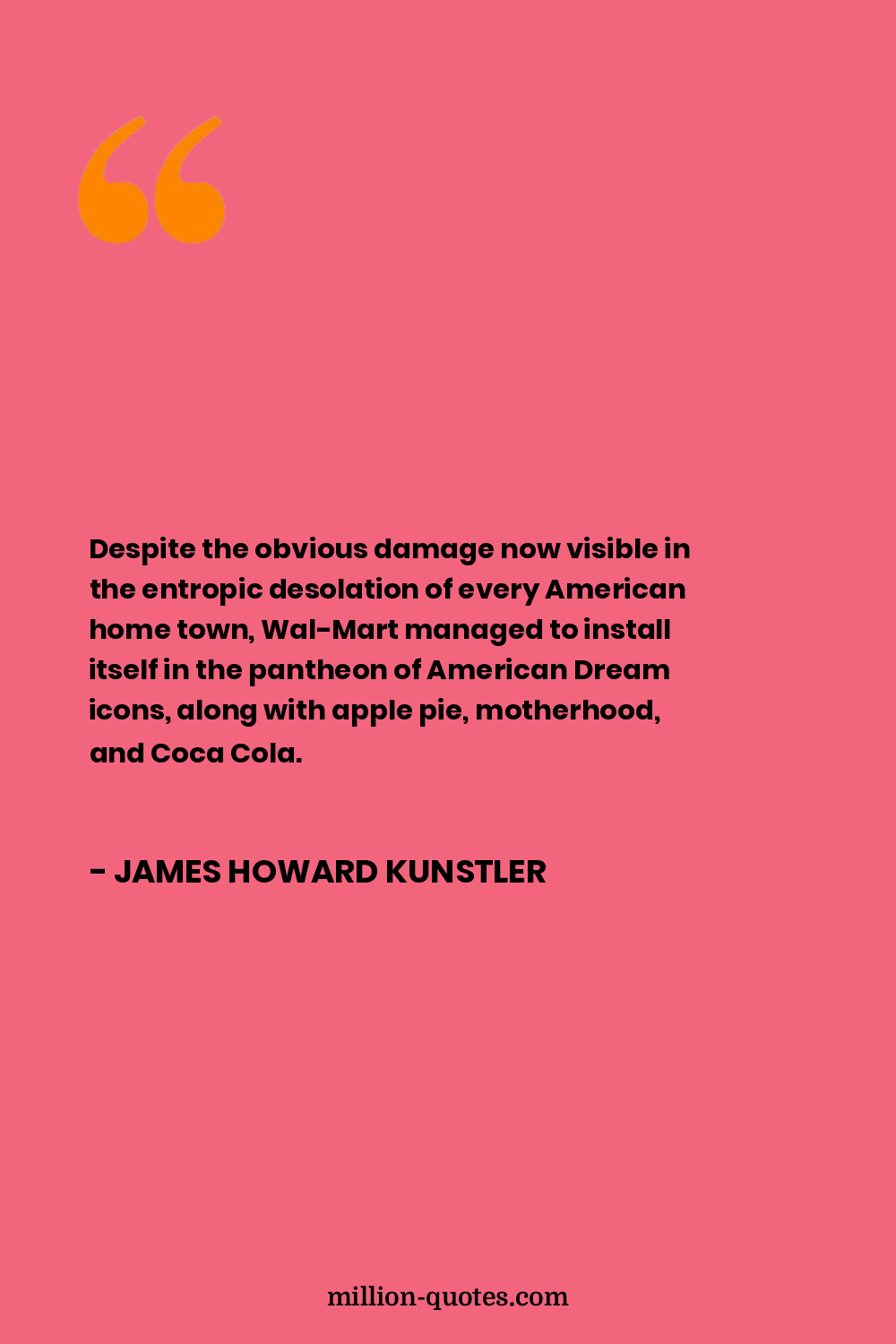 Despite the obvious damage now visible in the entropic desolation of every American home town, Wal-Mart managed to install itself in the pantheon of American Dream icons, along with apple pie, motherhood, and Coca Cola.
