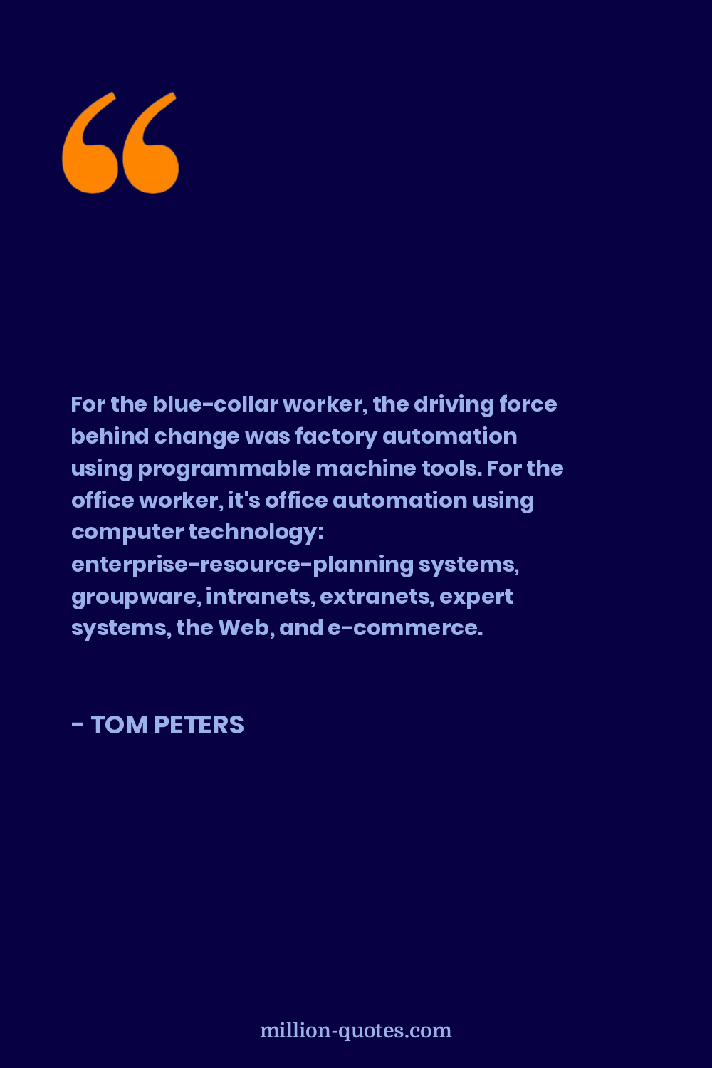 For the blue-collar worker, the driving force behind change was factory automation using programmable machine tools. For the office worker, it's office automation using computer technology: enterprise-resource-planning systems, groupware, intranets, extranets, expert systems, the Web, and e-commerce.