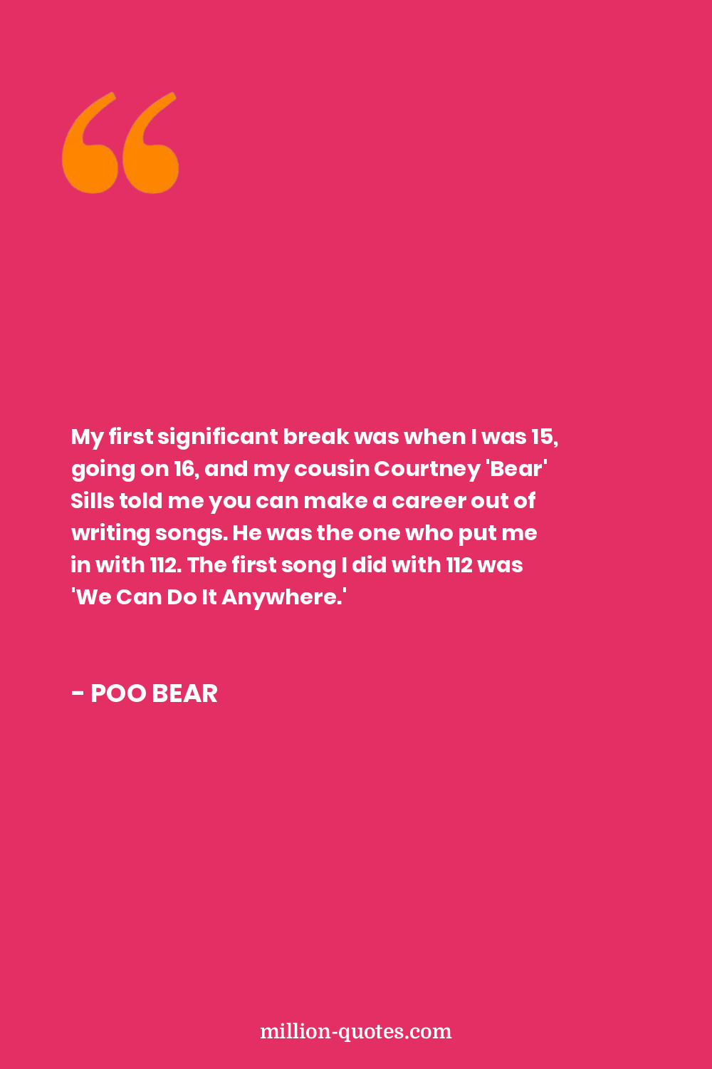 My first significant break was when I was 15, going on 16, and my cousin Courtney 'Bear' Sills told me you can make a career out of writing songs. He was the one who put me in with 112. The first song I did with 112 was 'We Can Do It Anywhere.'