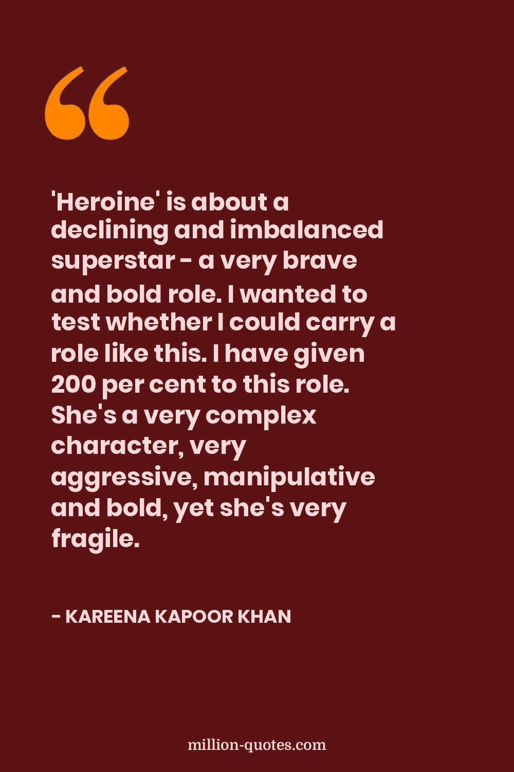'Heroine' is about a declining and imbalanced superstar - a very brave and bold role. I wanted to test whether I could carry a role like this. I have given 200 per cent to this role. She's a very complex character, very aggressive, manipulative and bold, yet she's very fragile.