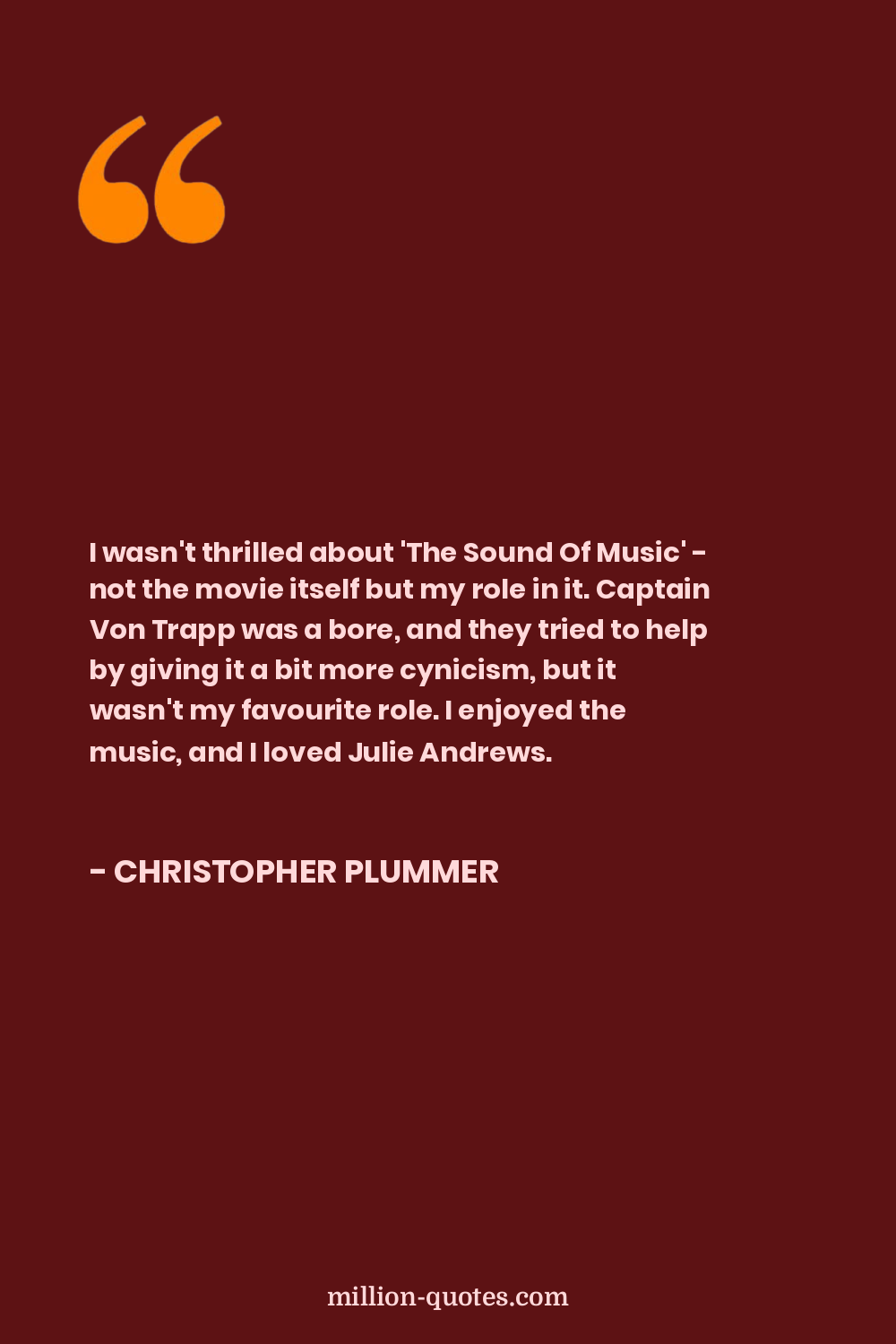 I wasn't thrilled about 'The Sound Of Music' - not the movie itself but my role in it. Captain Von Trapp was a bore, and they tried to help by giving it a bit more cynicism, but it wasn't my favourite role. I enjoyed the music, and I loved Julie Andrews.
