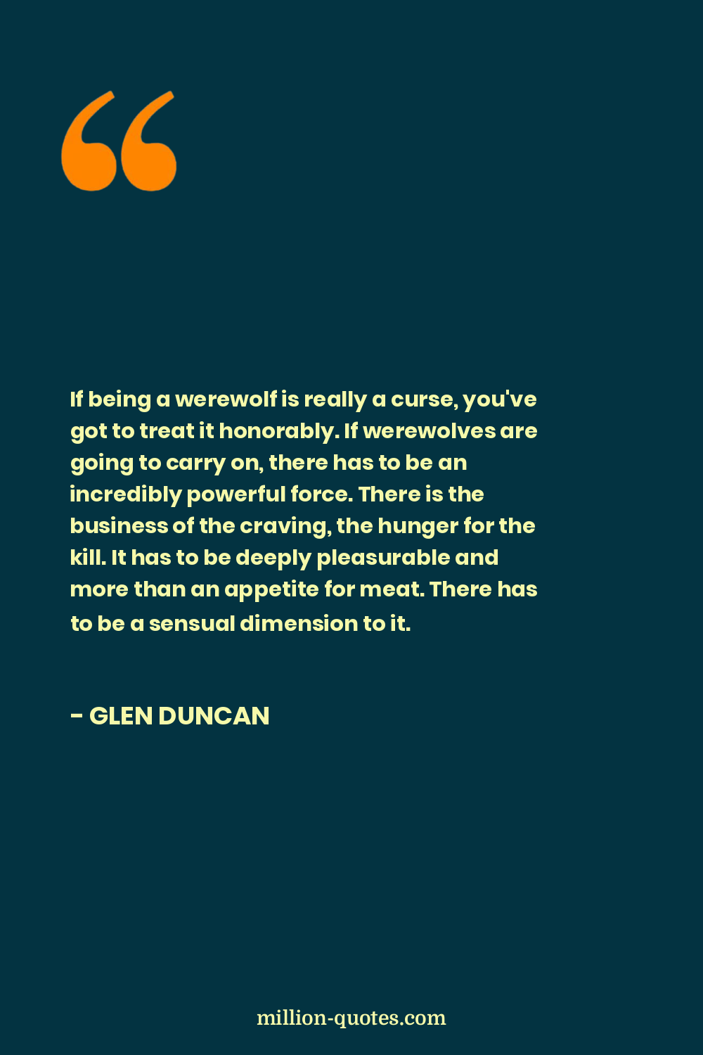 If being a werewolf is really a curse, you've got to treat it honorably. If werewolves are going to carry on, there has to be an incredibly powerful force. There is the business of the craving, the hunger for the kill. It has to be deeply pleasurable and more than an appetite for meat. There has to be a sensual dimension to it.