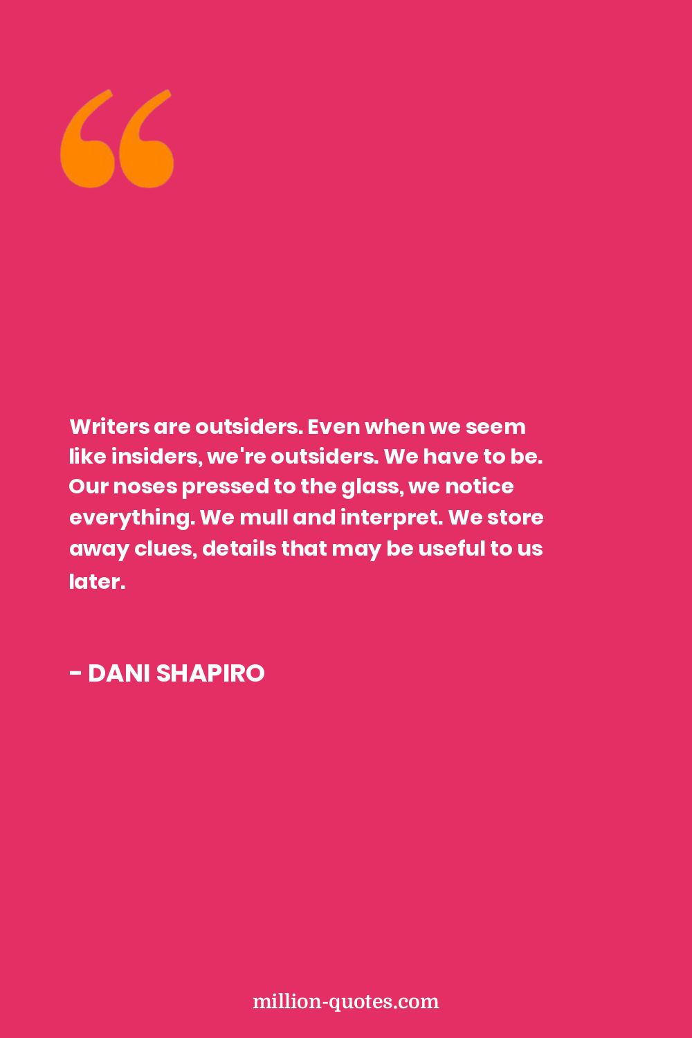 Writers are outsiders. Even when we seem like insiders, we're outsiders. We have to be. Our noses pressed to the glass, we notice everything. We mull and interpret. We store away clues, details that may be useful to us later.