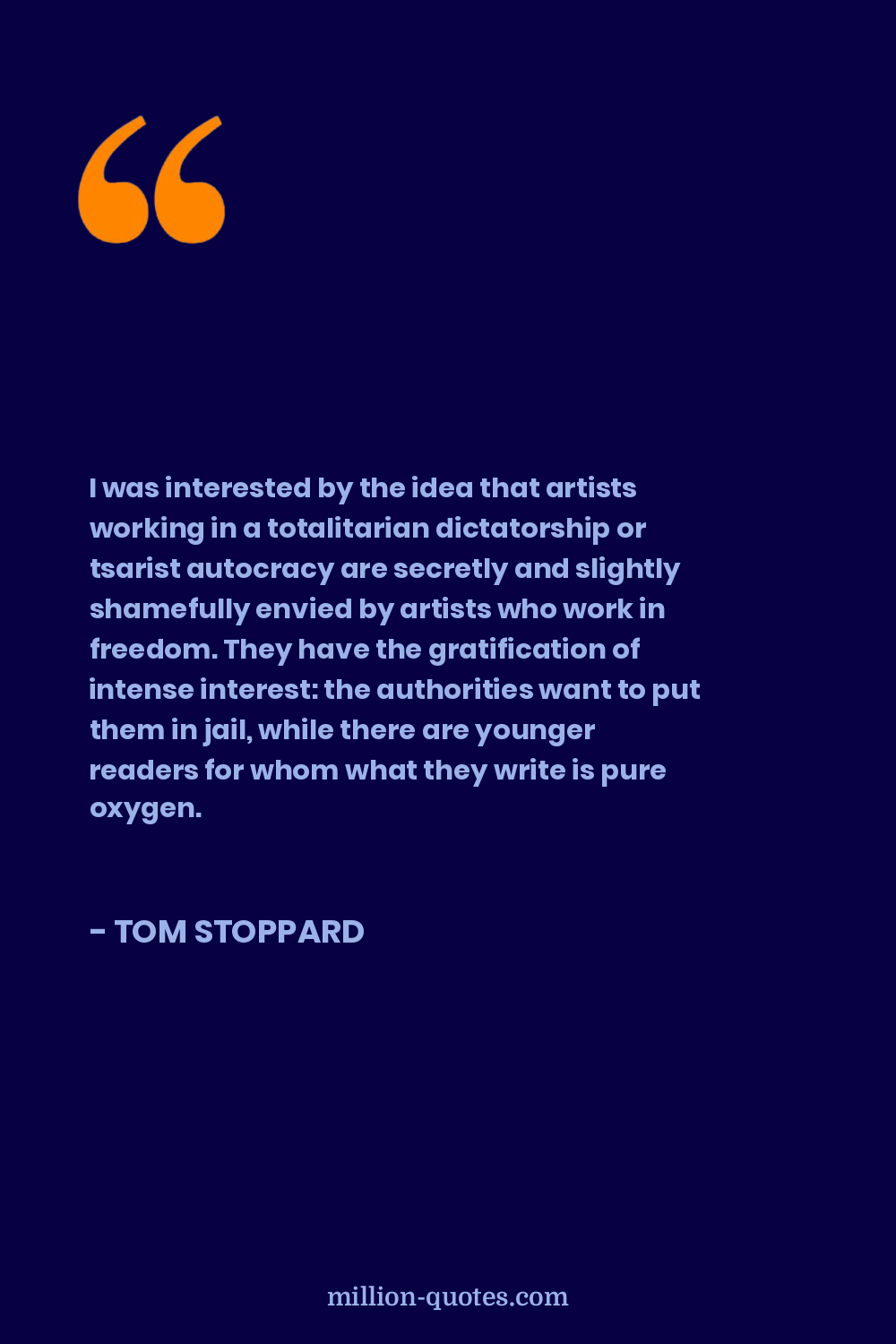 I was interested by the idea that artists working in a totalitarian dictatorship or tsarist autocracy are secretly and slightly shamefully envied by artists who work in freedom. They have the gratification of intense interest: the authorities want to put them in jail, while there are younger readers for whom what they write is pure oxygen.